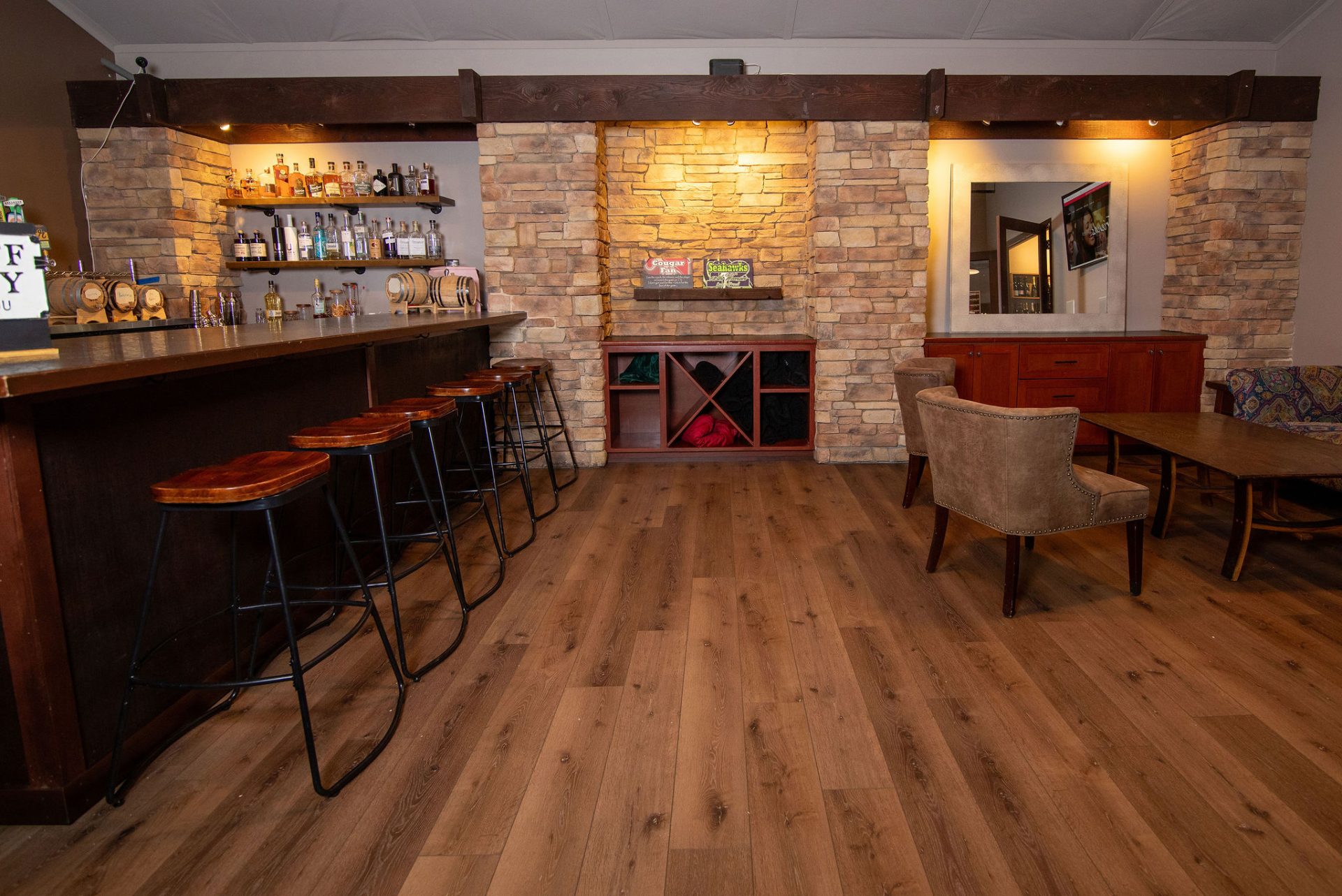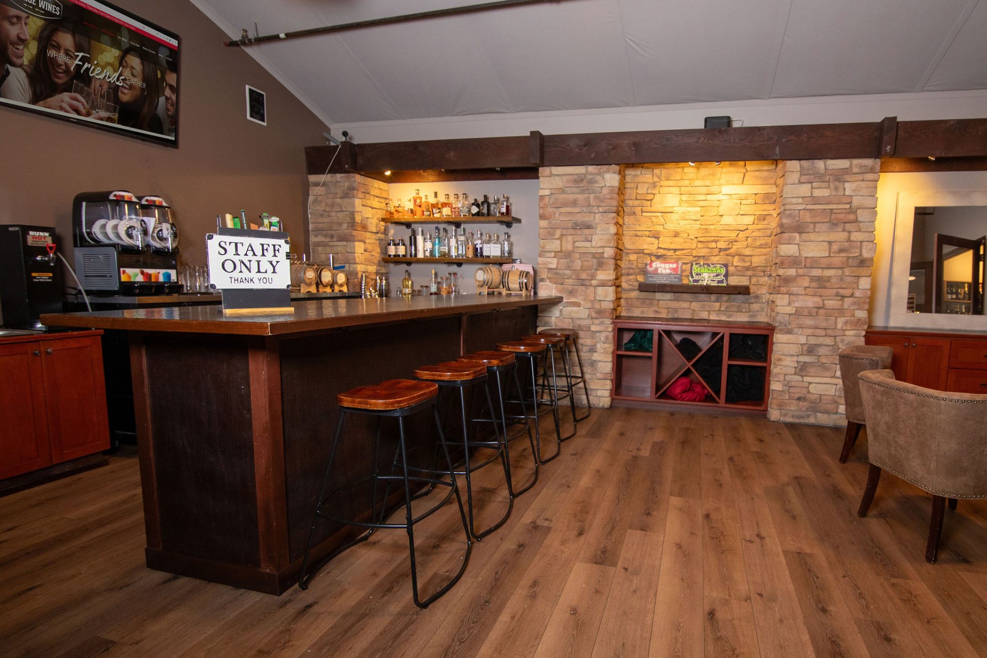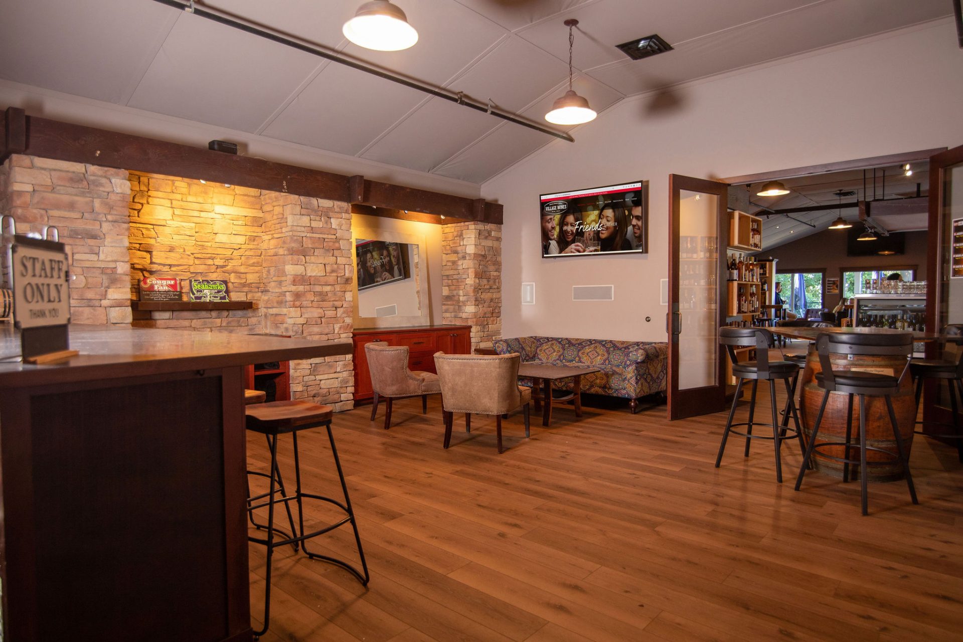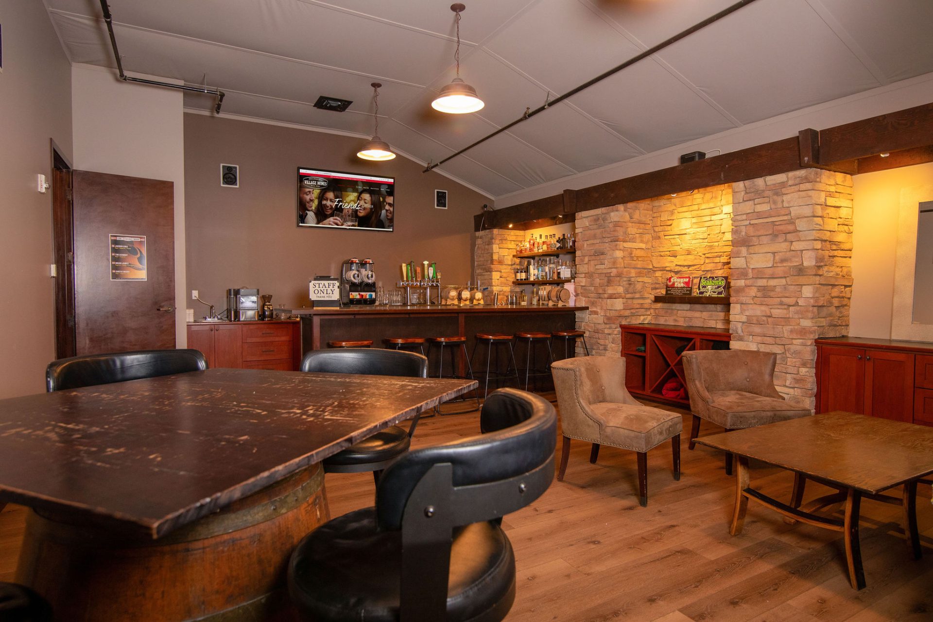 The Tap Room at Village Wines features two wide-screen TVs for presentations or entertainment, adjustable seating utilizing high tables and low couch seating, all within a stylish and relaxing atmosphere